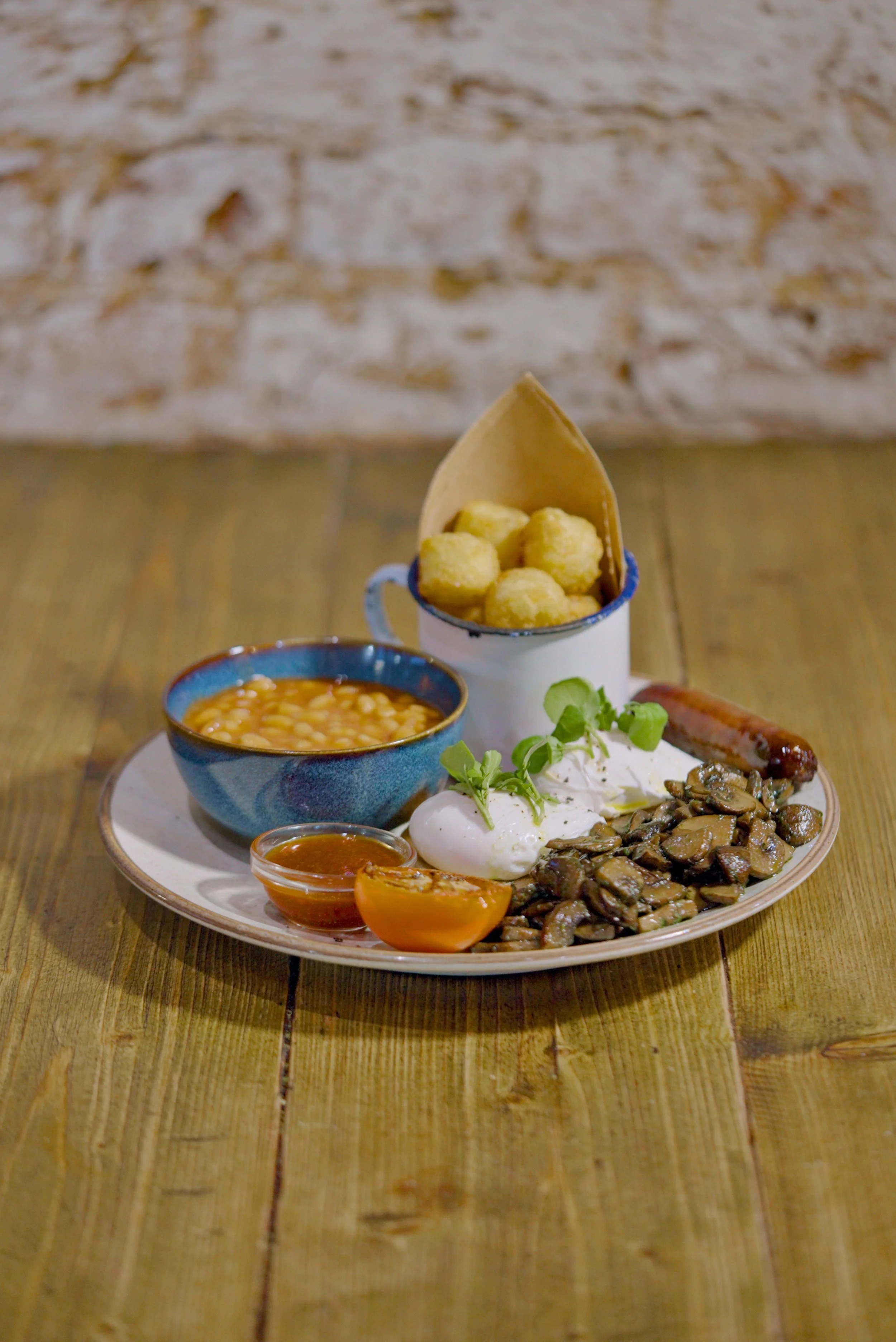 Beef butcher’s sausage, free-range eggs your way, roasted tomato, mushrooms, green salsa, baked beans, hash nuggets & sourdough toast.